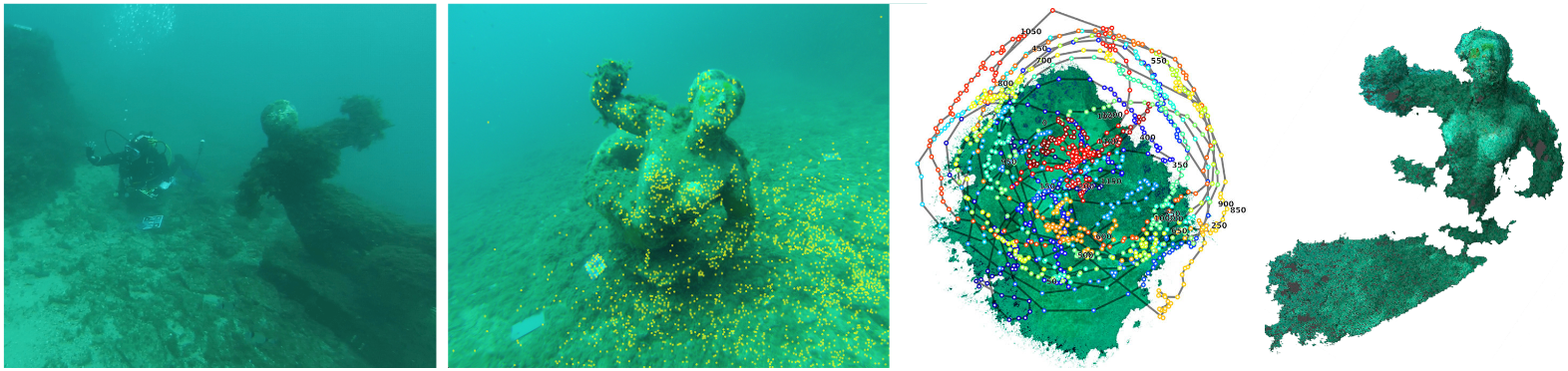 From left to right: a team member during a dive in the scene, a close-up on the mermaid with extracted keypoints, trajectory (successive camera poses) of the images in the dataset, and obtained 3D reconstruction